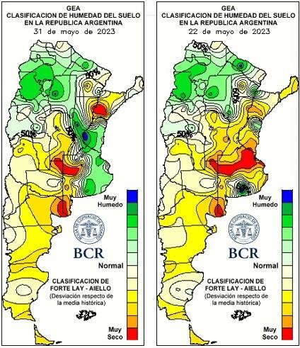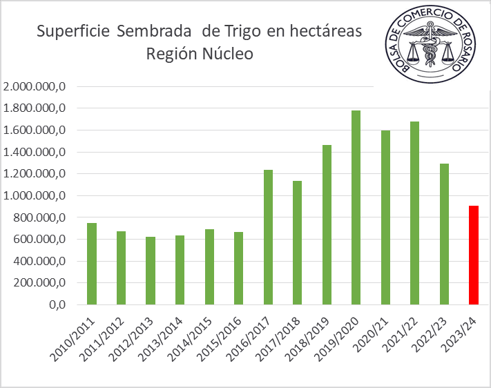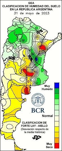 Tras el evento de lluvias del 23 al 29 de mayo, casi la mitad este del área núcleo tiene ahora una recarga del 50% o más del agua útil en suelos. Los acumulados fueron claves y posibilitan sumar nuevos lotes a la intención triguera en la franja este. Pero, hacia el oeste las lluvias fueron prácticamente nulas. A principios de mayo, por la falta de agua  se proyectaba una caída de siembra del 50%, respecto del ciclo anterior. Ahora, tras las lluvias en el este, la caída se amortigua con un recorte del 30%. La superficie de siembra se ubica por debajo del millón de hectáreas: 910.000 ha. De materializarse, sería la menor siembra de los últimos 7 años.