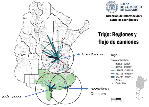 Hacia el sur del mapa, si se combinan los flujos de mercadería a través de las cartas de porte de los camiones y los radios de distancia a los puertos cerealeros de Bahía Blanca y Necochea, se visualiza una línea divisoria que coincide geográficamente con la línea que continúa el río Salado en provincia de Buenos Aires, delimitando lo que se conoce como Región Sur.