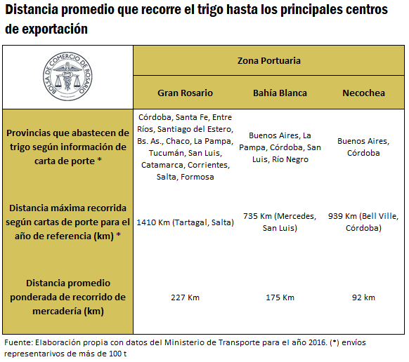 Según nuestra estimación, la distancia promedio que atraviesa un grano de trigo para llegar a las terminales del Gran Rosario es de 227 kilómetros, lo que es un 30% superior a la distancia que recorre el trigo que se dirige hacia los puertos de Bahía Blanca (175 km promedio), y cerca de una vez y media la distancia que recorre el grano que se embarcará desde las localidades de Necochea y Quequén (92 km promedio). Esta estimación surge de utilizar la matriz de transporte del informe citado oportunamente donde las distancias se ponderaron por las cantidades transportadas.