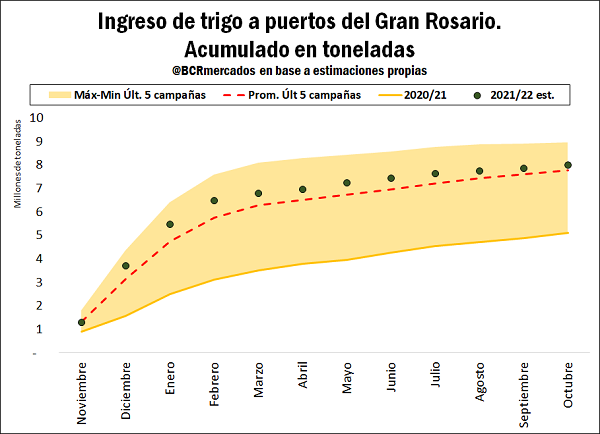 Se espera que en la campaña 2021/22, nuestro país exporte un total cercano a los 13 millones de toneladas de trigo. Desde los puertos del Gran Rosario se embarcaría unas 8,1 millones de toneladas del cereal, según nuestras estimaciones. Siguiendo una distribución similar a la de años anteriores, los puertos de Bahía Blanca deberían exportar un total cercano a las 2,8 millones de toneladas, con los puertos de Necochea apuntando a embarcar unas 1,4 millones de toneladas. Es necesario aclarar que estas estimaciones se logran acudiendo a promedios históricos, lo que se vaya a embarcar efectivamente desde cada zona portuaria va a depender de varios factores, tales como los rindes efectivos en las diferentes zonas productiva del país, los incentivos de precios que las empresas ofrezcan a los productores, el nivel del Río Paraná en los meses de la campaña, entre varios otros.