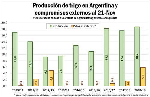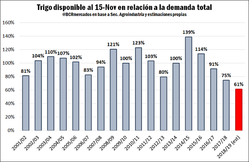 Al número anterior se le adiciona, además, compras del sector molinero por otras 422.000 toneladas, llevando el total comercializado a 7,6 millones de toneladas. En oposición a una oferta total de 19,3 Mt, ello significa que del trigo que recién empieza a cosecharse en Argentina y para toda una campaña comercial que formalmente no empieza hasta dentro de 10 días restan disponibles no más de 11,7 millones de toneladas, el menor volumen de los últimos 5 años. Incluso entonces, en la campaña 2013/14 cuando se contaba a mediados de noviembre con una disponibilidad de 11,3 millones de toneladas, la producción de trigo en Argentina era casi la mitad de lo que es hoy, unos 9,5 millones de toneladas.