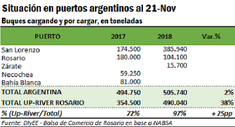 Según información de Thomson Reuters, al 16 de noviembre se llevaban exportadas 17,12 Mt, un 10,9% por debajo de la campaña pasada, pero un contundente 31,3% por encima del promedio de las últimas tres. Considerando una producción estimada por el USDA de 70 Mt en 2018/19, se lleva exportado el 24,5% de la misma. En noviembre del año pasado se llevaba exportado el 22,6% del producto, y el promedio de las últimas tres campañas es del 18%, lo que refuerza la teoría de que los embarques desde Rusia podrían encontrarse con serias dificultades en los próximos meses. Para los casi 8 meses que restan de campaña, del pronóstico de 35 Mt que exportaría Rusia, según el último informe mensual de oferta y demanda del USDA, al país ex soviético todavía le restarían 17,88 Mt para ser exportadas desde ahora hasta junio del año próximo.