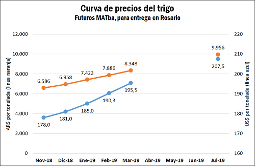 Bajo la expectativa de una campaña ajustada en términos de grano disponible, ya al día de hoy la curva de precios a futuro del trigo muestra una clara tendencia ascendente, tal como exhibe el gráfico adjunto. Partiendo de un valor de US$ 178/t o AR$ 6.586/t para el futuro con descarga en Rosario que vence este viernes 23, para la entrega en marzo el contrato en dólares ya exhibe un incremento del 10% a US$ 195,5/t mientras que en pesos, utilizando el tipo de cambio a dicho mes del contrato ROFEX, la suba alcanza el 27% hasta los AR$ 8.348/t. Con vistas a julio, a apenas 8 meses desde hoy, la suba del contrato en dólares resulta de nada menos que un 17% en tanto que en pesos el aumento alcanza el 51%, tasas muy atractivas si se las compara con las referencias en moneda local y extranjera del mercado, así como también en relación a la inflación esperada (según el REM del BCRA, para todo el año 2019 esta se ubicaría en torno al 27,8%.
