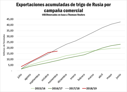 Hasta el mes de octubre, las exportaciones de Rusia en la campaña 2018/19 (que va de julio de 2018 a junio de 2019) han tenido un gran dinamismo, manteniéndose por encima de las tres campañas anteriores, incluso a pesar de la caída en la producción. De este modo, el saldo exportable en Rusia se ha ajustado dramáticamente previéndose que desde noviembre y por lo que resta de la campaña, los despachos soviéticos se mantengan por debajo de la media.