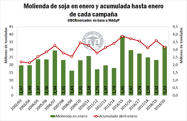 Sin embargo, analizando la molienda desde el inicio de la campaña comercial, se puede observar que el procesamiento de poroto presenta un marcado letargo respecto de lo ocurrido en años anteriores. En el acumulado desde abril hasta enero, se llevan industrializadas 31,6 Mt de la oleaginosa, un 12% menos que lo ocurrido en la campaña anterior, sólo equiparable a lo acontecido en las campañas en las que severas sequías afectaron fuertemente a la producción y redujeron la disponibilidad de soja en el mercado local.