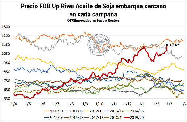 Los favorables precios de los derivados de soja han continuado durante febrero, destacándose en particular el aceite de soja que en ésta última semana alcanzó máximos en siete años, apuntalado por la ajustada hoja de balance de la oleaginosa en Estados Unidos. Además, a esto se le suma una limitada disponibilidad de colza en Canadá y ajustados volúmenes de aceite de girasol en Ucrania, apuntalado los precios de todo el complejo oleaginoso mundial.