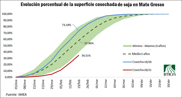 Un comentario aparte merece el marcado retraso en la cosecha en Brasil (la más lenta en 10 años), consecuencia de las lluvias de las últimas semanas que han impedido un normal desarrollo en las labores de cosecha. Por ejemplo en Mato Grosso, la principal región productora de soja de nuestro vecino país, sólo se lleva cosechado un 34,5% del área total implantada, cuando a éstas alturas del año anterior se llevaba un 73%, y el promedio de los últimos cinco años fue de un 58%.