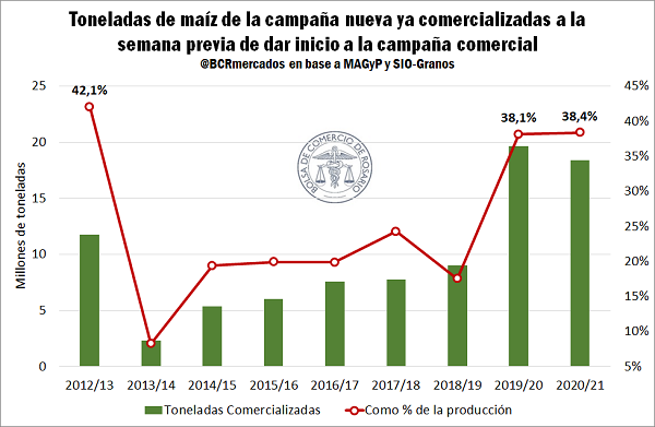 En cuanto al maíz, un dato que resulta interesante es que, a tres días del comienzo oficial del nuevo ciclo comercial 2020/21, ya se llevan comercializas 18,4 Mt de la campaña, el segundo mayor volumen sólo superado por lo ocurrido en la 2019/20. Sin embargo, considerando que la producción para la 2020/21 se espera sea menor que en el ciclo anterior, tomando el grano ya comprometido como proporción del total de producción para cada campaña se puede apreciar que es un 38,4% del total, lo cual supera levemente lo acontecido en la 2019/20. Sin embargo, algo en lo que difieren la 2020/21 con la 2019/20 es que de las 18,4 Mt comercializadas hasta el momento, el 76% se encuentra con precios en firme, en tanto que las 19,6 Mt que se llevaban comercializadas hasta la semana previa al inicio de la campaña anterior, el 71% se encontraba con precio en firme, mientras el 29% restaba fijar precio.