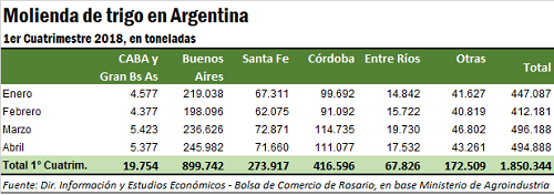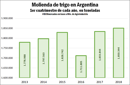 Según información oficial del Ministerio de Agroindustria, la molienda de trigo acumulada en los meses enero-abril de 2018 en Argentina suma 1,85 millones de toneladas, el registro más alto desde el primer cuatrimestre del año 2012.