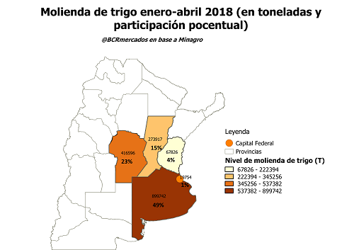 Discriminada por provincia, la mayor parte de ese procesamiento tuvo lugar en la provincia de Buenos Aires con 900.000 toneladas, casi la mitad del total procesado a nivel país. Le sigue, en orden de importancia, la provincia de Córdoba donde se molieron más de 400.000 toneladas, representando un 23% del total. La provincia de Santa Fe, en tanto, ocupa el tercer lugar con cerca de 275.000 toneladas y un peso del 15% sobre el total nacional. En Entre Ríos se procesaron cerca de 68.000 toneladas (un 4% del volumen procesado en Argentina) y finalmente en CABA y el Gran Buenos Aires se procesaron entre enero y abril algo menos de 20.000 toneladas, o un 1% del volumen nacional. El resto de las provincias, con una participación del 9%, suman otras 173.000 toneladas de trigo molidas en el primer cuatrimestre del año.