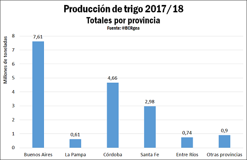 La mayor molienda de trigo por parte de la provincia de Buenos Aires obedece a que cerca del 43% de la producción nacional se encuentra localizada en dicha provincia (aproximadamente cerca de 7,61 Mt de trigo). La segunda provincia productora es Córdoba con 4,66 Mt y una participación del 27% en el total nacional. Santa Fe es la tercer provincia productora con 2,98 Mt. Estos datos pertenecen a las estimaciones de GEA-BCR para la campaña 2017/2018