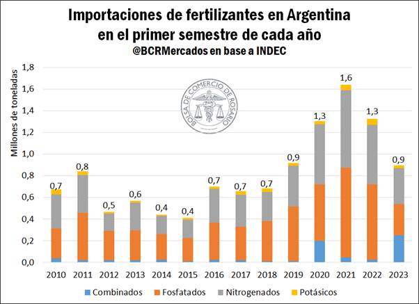 Un punto a destacar en materia de disponibilidad de insumos para la campaña 2023/24, la importación de fertilizantes durante el primer semestre disminuyó un 33% en relación con el mismo período del año anterior. Esto cobra relevancia si se tiene en cuenta que sólo se produce a nivel local el 50% de la urea que se consume, mientras que se importa el total del resto de los productos. No obstante, según fuentes locales durante las últimas semanas se frenó la totalidad de las ventas de urea debido a la incertidumbre respecto a la aplicación de nuevos impuestos a las importaciones, que se confirmaron este domingo con el Decreto 377/2023. Debido a que Argentina todavía se encuentra en época de fertilización para macollaje de trigo, la demanda de urea se mantuvo alta, pero no hubo gran oferta por parte del mercado. Más aún, lo que más preocupa actualmente es la disponibilidad de fertilizantes para lo que será la siembra de maíz de los próximos meses.