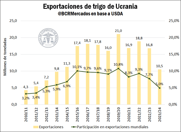 De acuerdo a los datos del Departamento de Agricultura de los Estados Unidos (USDA), durante la campaña 2022/23 Ucrania se consolidó como el quinto exportador de trigo a nivel mundial, alcanzando una exportación total de 16,8 Mt y representando el 7,7% de las exportaciones mundiales totales. No obstante, dichas exportaciones descendieron un 11% con respecto a la campaña anterior, y se estima que caerán un 38% adicional durante la campaña próxima. Esta fuerte caída se fundamenta no sólo en la imposibilidad actual de exportación por vía marítima tras el fin del acuerdo del mar Negro, sino también en las dificultades de exportación por vía terrestre que existieron este año debido a los instrumentos regulatorios impuestos por la Unión Europea para limitar los granos provenientes de Ucrania. A esta incertidumbre se le suman los daños en la infraestructura de los puertos tras los ataques diarios por parte de Rusia.