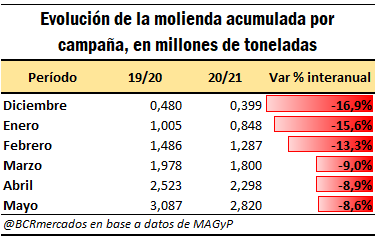 De esta manera, y tal como se puede apreciar en el cuadro anterior, cuando tomamos el acumulado desde el inicio de la campaña hasta el último mes disponible, podemos observar que la merma con relación a la campaña anterior se recortó considerablemente entre los meses de enero y marzo, casi 8 puntos porcentuales, mientras que en los últimos dos meses sólo se recortaron 0,4 p.p.