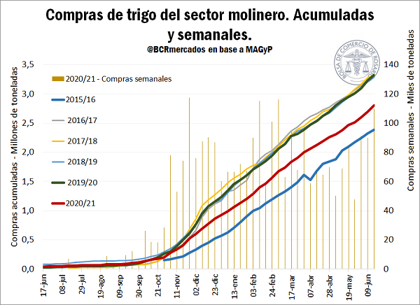 Lo que ocurre con las compras del sector molinero se encuentra en línea con lo descrito ut supra. Las compras de trigo 2020/21 del sector hasta la fecha totalizan 2,8 Mt, el volumen más bajo en seis años para igual momento del año, aunque en las últimas tres semanas las adquisiciones del sector mostraron un leve repunte y totalizaron 290 mil toneladas. Dado que una de las características distintivas del sector es que, usualmente, mantiene bajos niveles de existencias de granos e industrializa el cereal a medida que lo va adquiriendo, para alcanzar la marca de 5,85 Mt para moler en la actual campaña, aún debe adquirir 3 Mt del cereal.