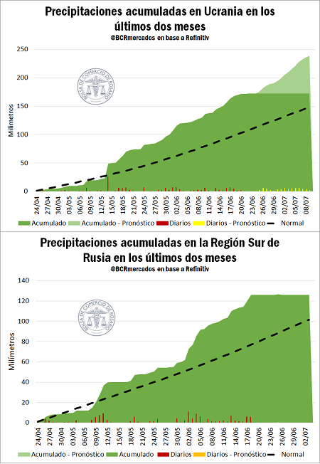 En los últimos dos meses, las principales regiones productivas de ambos países recibieron considerables precipitaciones. Tal como se puede apreciar en los siguientes gráficos, las lluvias acumuladas desde fines de abril a la fecha en Ucrania y en la región sur de Rusia, la principal región productora de trigo, estuvieron considerablemente por encima de las precipitaciones normales para el período, por lo que las condiciones del cultivo han mejorado sustancialmente.
