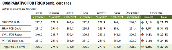 De todas maneras, un hecho que merece mención es que el precio FOB del trigo pan en los puertos del UP River es el que presenta un menor incremento interanual de todos los precios considerados. Respecto de los valores obtenidos un año atrás, se aprecia un incremento del 21%, mientras que, en los demás puertos, el aumento va desde el 23 hasta el 31%.