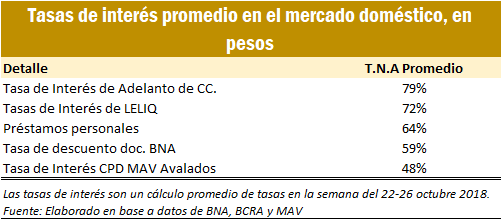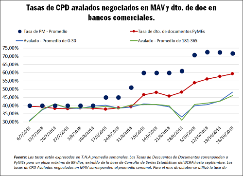 Las multas de octubre, la tasa de interés por los adelantos en la cuenta, por el contrario, en el 79% (TNA) y las tasas de los datos personales en el 64%, según la información oficial del Banco Central de la República Argentina. El costo financiero total a pagar es mayor cuando se incorporan diferentes costos, como el presupuesto propio y el impuesto al cheque para el descuento de documentos. La dispersión de las tasas en el mercado se amplía según la línea de subsidios para PyMEs o según el banco comercial. La reducción de los documentos del Banco se ubicó en el 59%. De todos los modos, la tasa de interés del descuento de los cheques de pago diferido en el Mercado Argentino de Valores se ubicó en el 48% (TNAV), en el nivel más bajo de los anteriores.