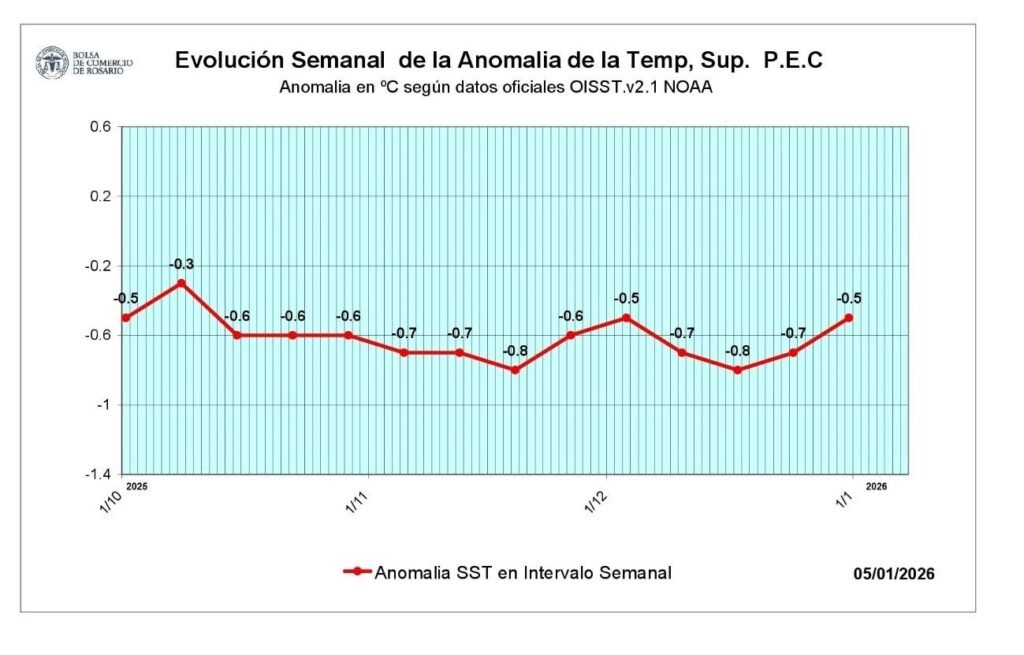 El seguimiento de alta frecuencia refuerza ese diagnóstico. Según los datos semanales de la NOAA, en la primera semana de enero la anomalía se ubicó en –0,5, umbral considerado técnicamente como neutralidad. Si bien será necesario que este comportamiento se sostenga para confirmar oficialmente el cambio de fase, Elorriaga es contundente: “Es muy difícil que vuelva a producirse un enfriamiento del Pacífico que condicione las lluvias en lo que resta del verano”.