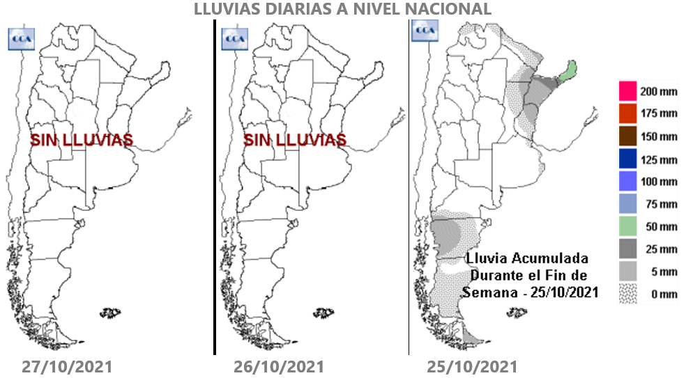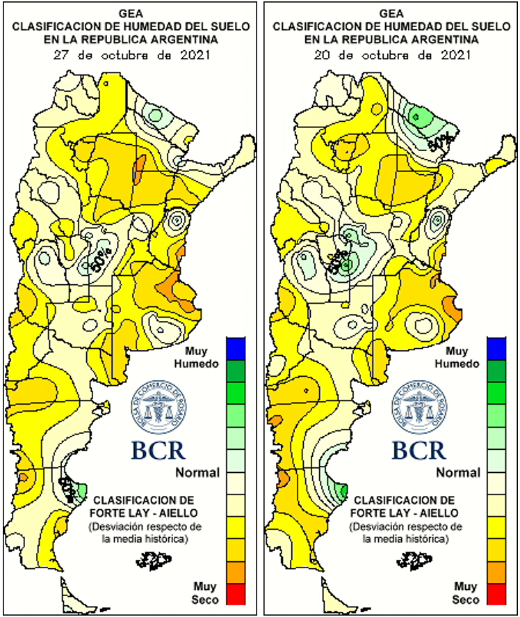 “El forzante “Niña” ya está instalado y lentamente está aumentando su intensidad y su efecto negativo sobre la oferta de agua. Esto ya se refleja en la dinámica de las precipitaciones: solo se producen por la interacción entre el aire cálido y húmedo proveniente del noreste y el ingreso de frentes fríos desde el sur argentino”, explica Aiello. “A este escenario complejo debemos sumarle dos fenómenos que están aumentando la rigurosidad climática”, agrega el consultor Elorriaga. “Por un lado, el actual enfriamiento de la temperatura superficial del Atlántico disminuyó el ingreso adicional de aire húmedo a la franja este del país. Lo otro es la instalación de un pulso cálido producto de la circulación norte y la alta radiación solar. Desde el martes 26 tenemos temperaturas casi de enero. El pulso podría extenderse hasta el fin de semana”. Aiello afirma que el escenario es muy complejo para el centro y el norte del país y que podría condicionar en algunas zonas el avance de la siembra temprana de soja. Hay algo que podría jugar a favor de los cultivos, la transición a noviembre muestra condiciones muy parecidas a las que se dieron antes de las importantes lluvias de inicios de setiembre. Los modelos de pronóstico no indican que los fenómenos serían tan importantes, pero muestran aportes de agua que podrían proporcionar alivio sobre todo al centro del país.