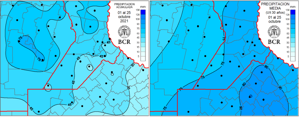 “Lotes que hace 10 años no se podían sembrar por estar siempre con excesos, en éste año volvieron a producción por la falta de agua. El paisaje se ve muy diferente: las lagunas históricas de la zona han desaparecido”, dicen los ingenieros de Teodelina, sur de Santa Fe. Y agregan: “en lo que va del 2021 recibimos solo 500 mm, cuando tendríamos que estar cerca de los 750 mm”. Octubre será otro mes por debajo de la media en la región. El NE bonaerense solo recibió la tercera parte de lo que indican las estadísticas de los últimos 30 años. Al este cordobés le fue mucho mejor y está muy cerca de la media. En el sur y centro sur de Santa de los 85 mm de media solo se recibieron 37 mm. A favor de octubre hubo lluvias que fueron claves y muy oportunas para el trigo y la siembra gruesa. Pero una vez más octubre no cumplió, y ya van 20 meses en que a nivel regional las lluvias no alcanzan las estadísticas entre el 2020 y en lo que va del 2021. Algunas excepciones son enero del 2021 con lluvias muy importantes o abril (2021) con un pulso muy fuerte que dejó inundaciones en el área de Marcos Juárez. Marzo de este año también dejó lluvias que fueron claves para el comienzo del trigo. La falta de agua de los últimos dos años ha cambiado el paisaje en la región y no deja ser una fuerte amenaza para el ciclo 2021/22: con una “Niña” por delante será muy difícil revertir esto. A los perfiles les falta muchos milímetros para afrontar el verano y hay mucha preocupación en el sector. Solamente para el primer metro y considerando la demanda de una pradera hace falta entre 80 y 120 mm para lograr condiciones óptimas de humedad en la región.