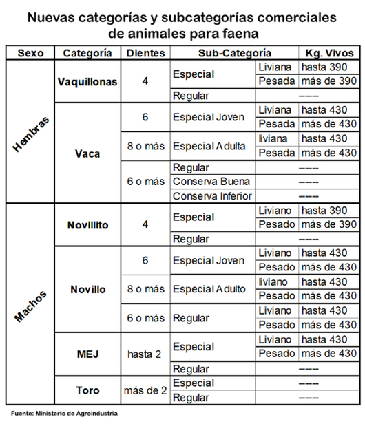 Una vaquillona, por ejemplo, será una hembra de hasta cuatro dientes incisivos permanentes al momento de la faena y si tiene más de 390 kilos se subclasificará como vaquillona pesada.”Terneros y terneras no estarán contemplados en el nuevo sistema. En la práctica estas categorías ya no existían, se comercializaron hasta 2010, cuando se modificó el peso mínimo de faena, pero sus nombres se mantuvieron por costumbre. Ahora, corresponderán al novillito y la vaquillona”, explicó Otaño.