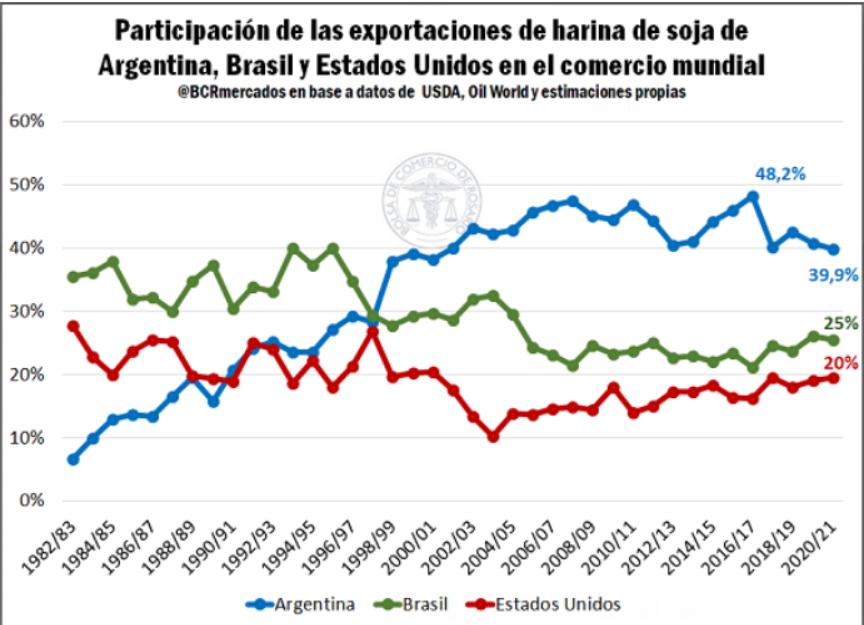 Según un informe de la Bolsa de Comercio de Rosario (BCR), la participación del país en el comercio internacional de harina de soja bajará a menos del 40%. La harina de soja contribuirá al país con US$13.232 millones. De acuerdo al reporte realizado por la BCR, la participación de la harina de soja en el comercio internacional será del 39,9%. En la campaña previa estuvo arriba del 40% e incluso llegó a un pico de 48,2% en 2016/20217.