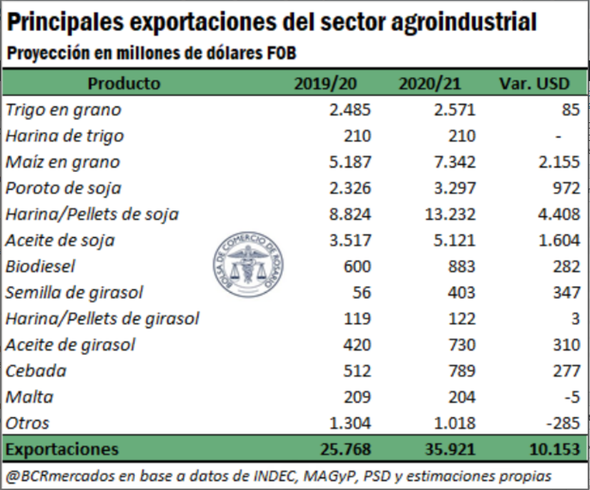 “El poroto de soja, por su parte, está en condiciones de registrar exportaciones por un valor cercano a los US$3300 millones en la nueva campaña, unos US$1000 millones más que el año anterior, mientras el girasol, la cebada y el resto de los cultivos aportarían otros 3260 millones de dólares, unos US$650 millones más que en 2019/20”, detalla.