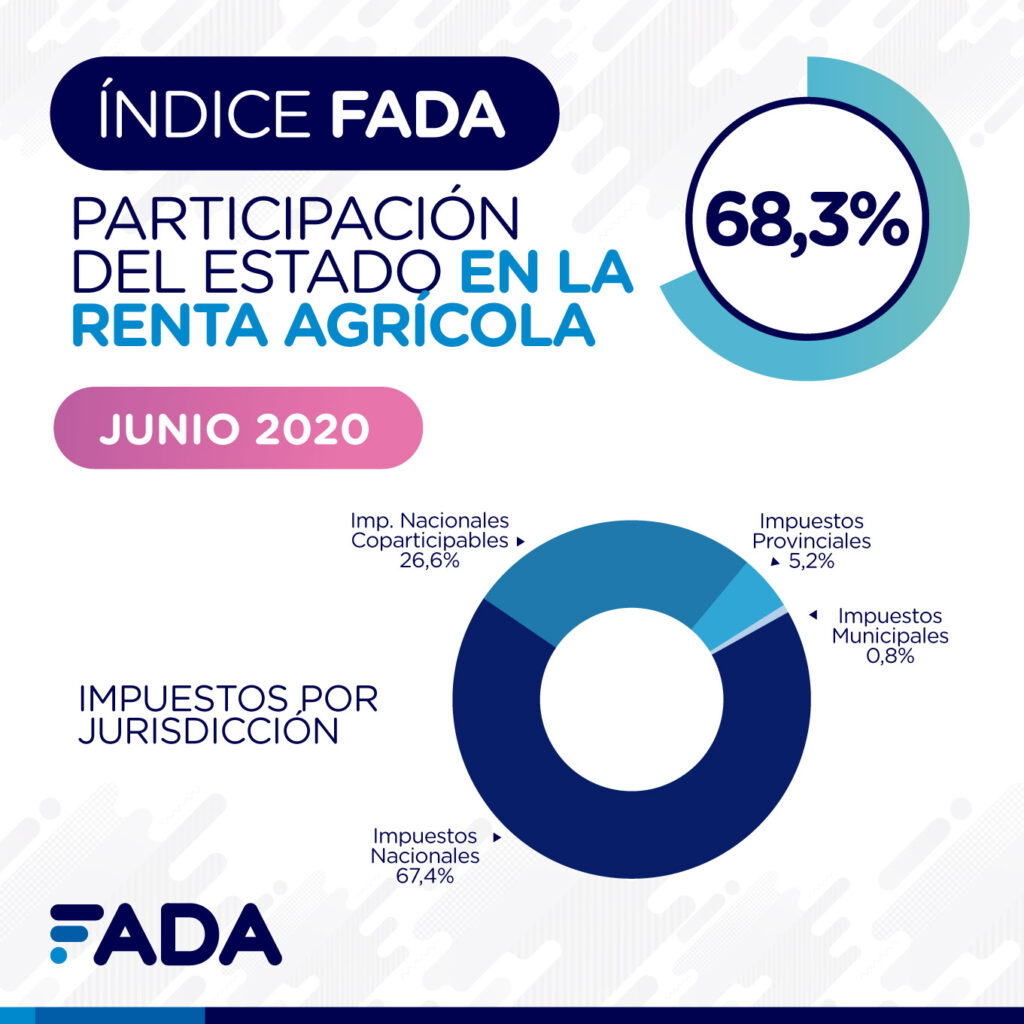 FADA (Fundación Agropecuaria para el Desarrollo de Argentina) publicó su característico Índice FADA. Este informe trimestral, que mide la participación del Estado en la renta agrícola, develó que de cada $100 de renta (ingresos menos costos) de una hectárea promedio, van $68,30 al Estado en impuestos nacionales, provinciales y municipales.Mientras que el promedio ponderado de cultivos a nivel nacional es de68,3%, la participación del Estado en soja es del 69,7%, maíz 65,4%, trigo 67,8% y girasol 59%.