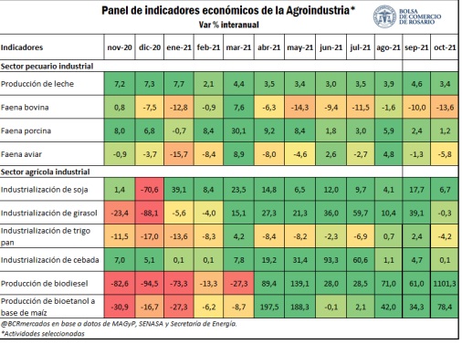 La mayor recuperación interanual se registra en este caso en el sector de la producción de biodiesel a base de soja. En octubre del 2021 la producción del biocombustible totalizó 146.626 toneladas, más de 11 veces el volumen producido en octubre del 2020 (12.289 toneladas), según datos de la Secretaría de Energía. Esta comparación parte de un nivel muy bajo de producción en 2020, cuando el sector sufrió duramente el retraso en los precios oficiales internos del biodiesel, en un contexto de débil demanda interna. Este año, si bien los precios y la demanda interna se han recuperado parcialmente, el motor fundamental de la producción ha sido el mercado externo.