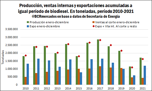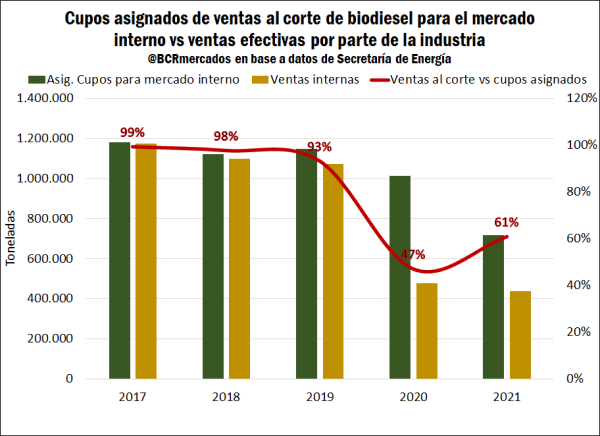 Al tiempo que en 2021, se recortaron los cupos asignados para ventas al corte ante la baja de los mandatos obligatorios de biodiesel en combustibles. A su vez, si se observan las ventas efectivas se mantuvieron muy estables y no se pudo cubrir dicho cupo por partes de las compañías, las cuales registran menos volúmenes de producción respecto a los últimos años.
