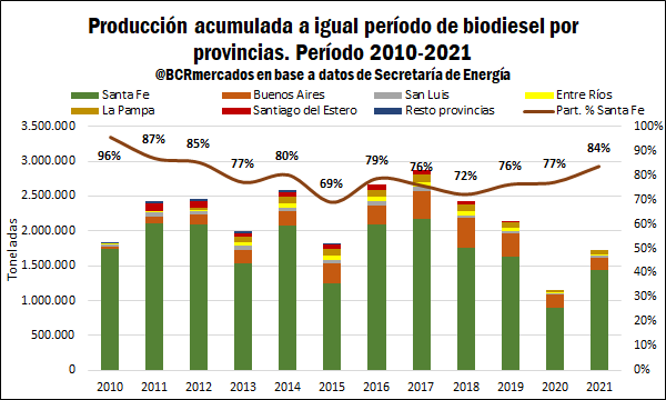 Si se analiza el rol de las diferentes provincias en materia productiva de biodiesel, destaca fuertemente la provincia de Santa Fe con una participación del 84% del total producido en el año 2021. Dicho guarismo es un máximo desde el año 2012, aunque se logra observar que la producción provincial se encuentra por debajo del año 2019. En este sentido, destaca la menor elaboración de biodiesel en la provincia de Buenos Aires que se ubicó en 0,18 Mt en 2021, es decir, levemente por debajo del fatídico año 2020 y representando una caída del 44% en la producción respecto al año 2019.