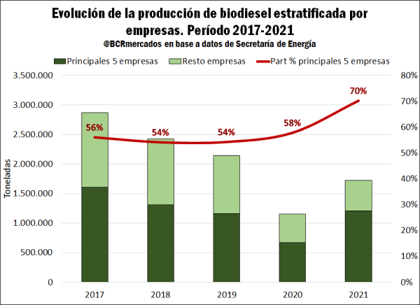 En el siguiente gráfico, se puede observar la participación en la producción de las principales cinco empresas respecto al total y se vislumbra una tendencia al alza desde 2020 y alcanzando nada menos que el 70% en el año 2021. Es importante destacar que las empresas que abastecen las ventas al corte en el mercado local tienen prohibido por ley, abastecer el mercado externo, al tiempo que las vinculadas a la exportación no tienen cupos asignados para vender al corte en el mercado local. En este sentido, la baja en el corte de gasoil está afectando la demanda interna y las posibilidades de producción de las empresas enfocadas en el mercado doméstico que no pueden dirigirse a la exportación.