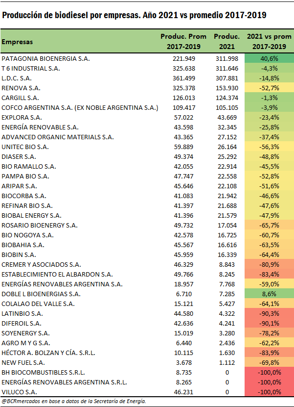 En este sentido, en el siguiente cuadro se puede observar la situación productiva por empresas. Del total de 32 empresas que produjeron biodiesel en 2021, salvo Patagonia Bioenergía el resto de las empresas registró un volumen producido por debajo del promedio alcanzado entre 2017-2019. A su vez, se logra destacar que las fábricas de menor tamaño que producen menos de 50.000 toneladas anuales fueron muy perjudicadas, registrando caídas en la producción superiores al 40% en la mayoría de los casos. En este sentido, los recientes cambios regulatorios que modificaron el corte obligatorio en biodiesel obligaron a recortar fuertemente la producción, sumado a que en 2020 los precios fijados internamente perjudicaron los márgenes de rentabilidad y las posibilidades de producción con dichos valores.