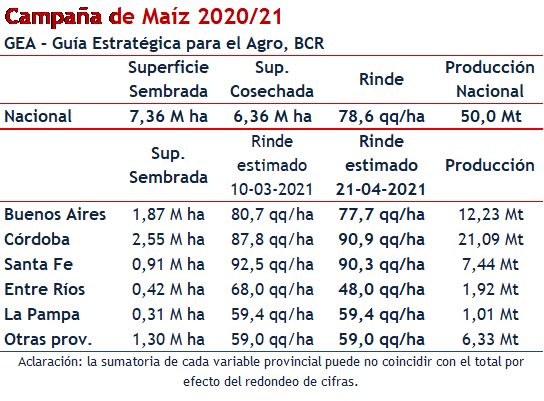 Maíz: ajustes negativos para el resto de la región pampeana El maíz muestra un menor avance en la recolección, respecto del año pasado: 20% del área nacional cubierta versus 30% el año pasado. En este mes se realizaron ajustes con los datos de cosecha. En términos de rinde, Entre Ríos es la que más sufre con un descuento 20 qq/ha respecto a lo estimado en marzo y pasa a un promedio de 48 qq/ha. La provincia de Buenos Aires le sigue con un descuento de 3 quintales y en Santa Fe el rinde se ajusta con 2 quintales menos.