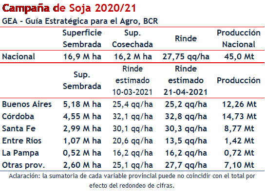 Soja: el oeste y norte del país contienen la caída de producción y la menor área sembrada De los 20 M ha que se sembraban hace siete años, la oleaginosa ha caído año a año hasta perforar en este ciclo 2020/21 la barrera de los 17 M ha. Con los ajustes realizados por satélite sobre la región núcleo y en Entre Ríos y cambios sobre otras zonas, la siembra argentina se estima en 16,9 M ha, y la superficie cosechable en 16,2 M ha. Finalmente, la caída interanual en área sembrada es de 1,7%.