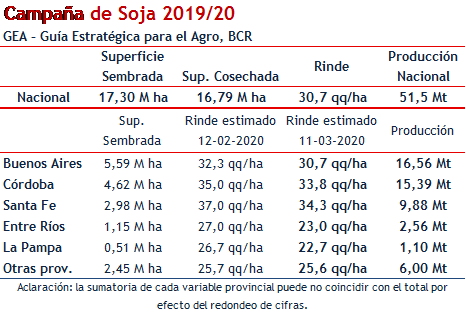 Queda detrás la posibilidad de alcanzar 55 Mt como se estimaba en febrero. El ciclo de la soja volvió a sufrir un revés en las condiciones climáticas y a partir de la tercera semana de febrero afrontó condiciones extremadamente secas. Con suelos que se han quedado sin reservas en los casos de soja de segunda, este ha sido el cultivo más afectado. Se estima que la falta de agua malogrará 510 mil ha, que en gran se tratan de cuadros de sojas de segunda. Tras el crecimiento del área triguera, la soja de segunda ocupa este año casi 5,6 M de ha, o sea el 32% de las 17,3 M de ha de la oleaginosa en Argentina. Por eso, la caída de rindes se hace sentir sobre los promedios, sobre todo en la franja este de Argentina, ya que en buena parte de la región pampeana se estiman rindes en soja de segunda que podrían quedar por debajo de los 15 a 25 qq/ha. Con este nuevo panorama, el rinde nacional promediaría 30,7 qq/ha, 1,7 quintales menos que en el informe anterior. Por lo tanto, la producción de soja se estima en 51,5 Mt.
