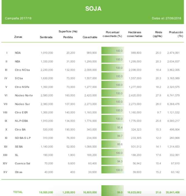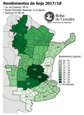 Restan recolectar 175 mil hectáreas en la provincia de Buenos Aires, para finalizar la campaña 2017/18. A la fecha el avance nacional de cosecha cubrió el 99 % del área apta, entregando un rinde promedio nacional de 21,6 qq/Ha y permitiendo acumular más de 35,8 millones de toneladas. Una vez concluida la recolección del área remanente la producción ascenderá a 36 MTn, reflejando una caída interanual del 37,4 % debido a condiciones climáticas adversas durante el ciclo del cultivo, como así también a una reducción del área implantada del 6,3 % en comparación a la campaña previa.