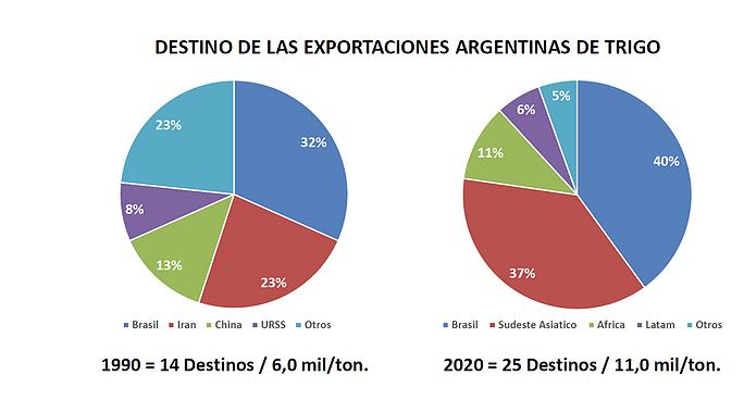 Hacia inicios de la última década del siglo XX, el trigo argentino se orientaba en especial a su futuro socio en Mercosur: Brasil. Durante años este destino representaba más del 80% del total del saldo exportable, considerándose como una suerte de “mercado interno ampliado”.