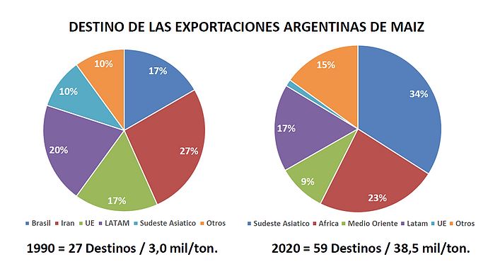 En 1990, un porcentaje considerable, se dirigía a Brasil, especialmente al nordeste de ese país, donde era utilizado por la producción avícola local, debido a que era mucho más económico su importación desde Argentina, que el traslado interno desde la región productora ubicada en los Estados de Paraná, Rio Grande do Sul y Santa Catarina.