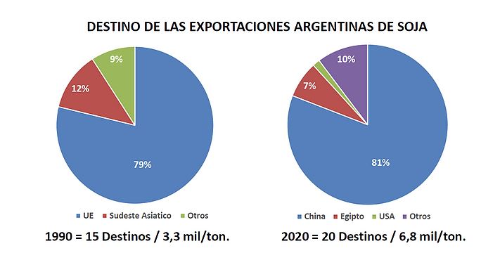 En soja también hubo cambios drásticos. No solo se duplicaron los envíos, sino que se invirtieron los destinos tradicionales entre periodos con la Unión Europea que lideraba el comercio bilateral en los 90s y China que explica más del 80% de los embarques.