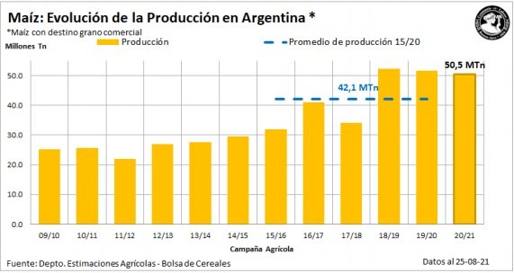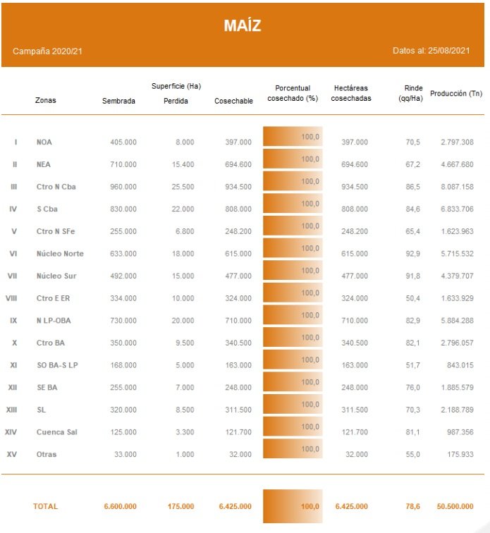 Luego de relevar un avance intersemanal de 1,9 puntos porcentuales, culminó la cosecha. Se logró acumular una producción de 50,5 MTn, 1 MTn menos que la campaña previa (Producción ciclo 2019/20: 51,5 MTn).