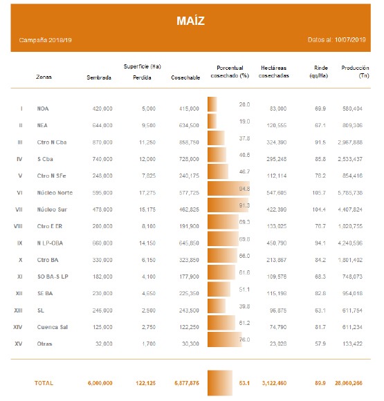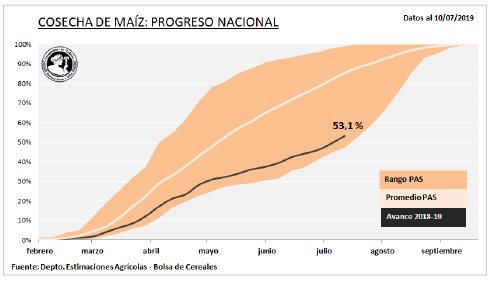 A la fecha ya el 53,1 % del área apta fue cosechado, marcando un avance intersemanal de 3,8 puntos porcentuales. El rinde medio nacional se ubica en 89,9 qq/Ha y permite acumular una producción parcial de 28 MTn. Transcurriendo ya el primer tercio del mes de julio, las labores de cosecha de maíz con destino grano comercial comienzan a tomar impulso en el centro y norte del país. Las buenas condiciones del tiempo y las heladas registradas permitieron que disminuya el nivel de humedad de los granos. Gran parte de los avances de recolección se relevaron en las provincias de Salta, Córdoba y Buenos Aires sobre lotes sembrados durante el verano.