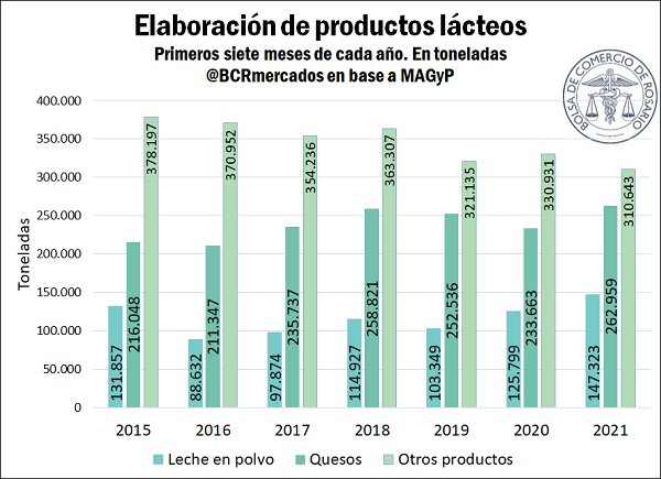 Consecuentemente, la elaboración de productos lácteos muestra un panorama auspicioso para la leche en polvo y los quesos, que vienen rompiendo sus récords de producción en este 2021. Las enteras y semidescremadas se llevan prácticamente la totalidad de producción de leche en polvo. Por su parte, los quesos de pasta blanda y semidura son los más relevantes en la producción quesera nacional.