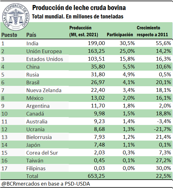 Nuestro país se destaca como un actor relevante en la producción mundial de productos lácteos. Con casi el 2% de la producción mundial en 2021, Argentina se ubica como el noveno productor mundial de leche cruda bovina, el principal producto lácteo a nivel global. De esta manera, escala siete posiciones en una década. Además, Argentina es el quinto productor mundial tanto de quesos, así como de leche en polvo entera.
