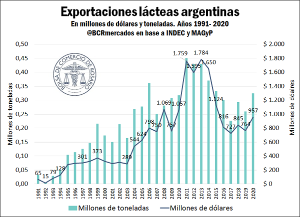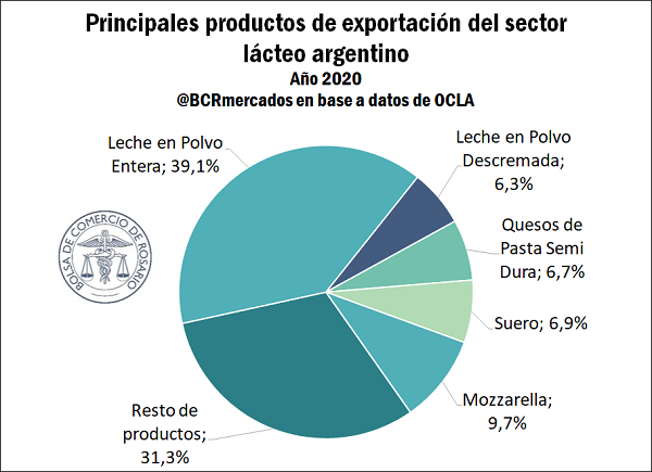 El comercio exterior lácteo se encuentra diversificado e industrializado. Con una amplia variedad de productos que son enviados al exterior, la producción láctea argentina se exporta a más de 75 países. La leche en polvo entera es el principal producto de exportación de un pujante complejo que espera volver a superar los US$ 1.000 millones en exportaciones en este 2021.