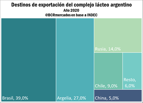 Por su parte, se proyecta un comercio mundial de leche en polvo por más de 1,4 Mt, con China y Argelia como principales compradores globales. El gigante asiático también es el principal comprador de manteca, en un podio que comparte con Rusia y los Estados Unidos de este mercado que en 2021 espera totalizar las 0,5 Mt. Finalmente, el mercado mundial de quesos, con proyecciones de comercio internacional por cerca de 1,6 Mt en 2021, encuentra a Rusia, Japón, China y Corea del Sur entre sus principales demandantes.