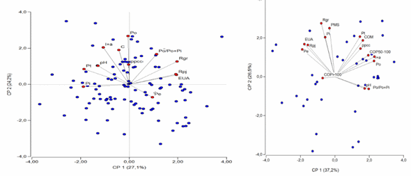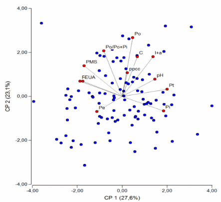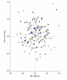 Se analizaron todas las variables en relación del rendimiento en grano, a fin de reconocer cuáles de las variables analizadas en los suelos estudiados ejercían mayor influencia en el rendimiento en grano. Fueron necesarios al menos tres componentes para conformar el vector de variación en una medida aceptable. En la Figura 4 se presenta el biplot entre las componentes 1 y 2. CP1 queda definido por las siguientes variables que se resultaron significativas Pt, Pi, PMS y EUA; para el CP2 quedaron seleccionadas L+a, C, Po y Pt. Por otro lado el CP3 selecciónó las variables relacionadas con la dinámica del fósforo Pe, Pt, Po y Po/Po+Pi.