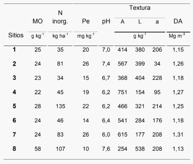 En las muestras de suelo se determinó: pH (relación suelo:agua 1:2,5); Contenido de carbono orgánico total (C), Nitrógeno total (Nt, Bremner, 1996); P extraíble (Pe, Bray & Kurtz, 1945); P inorgánico (Pi), y orgánico (Po) por el método de Saunders y Williams (1955); P total (Pt), mediante digestión con ácido perclórico empleando el procedimiento de (Sommers & Nelson 1972). Además se calculó la relación Po/Po+Pi, la cual da idea del ?equili rio? que puede existir entre el Po y el P total del suelo. Con respecto a los parámetros físicos se evaluó: textura, por el método de la pipeta (Gee & Bauder, 1986) y densidad aparente (Blake & Hartge, 1986). Posteriormente, se realizó la conversión de unidades para pasar de mg kg-1 a kg ha-1 utilizando la densidad aparente de cada sitio. Las propiedades edáficas de los sitios muestreados se detallan en la Tabla 1.
