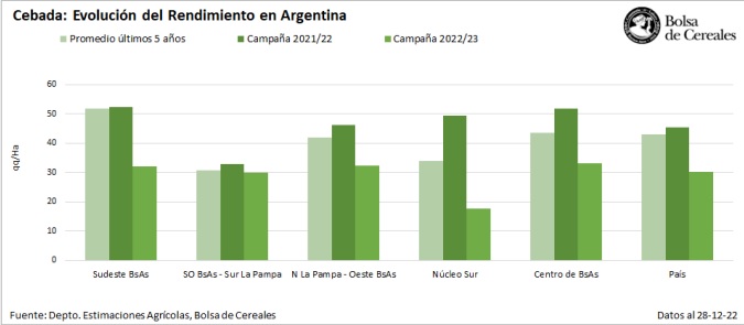 Sobre el Sur de Córdoba, el rendimiento medio regional se ubicó en 15,5 qq/Ha, un 41% por debajo al rendimiento medio de las últimas cinco campañas (Rendimiento medio U5A: 25,2 qq/Ha). Paralelamente, sobre ambos núcleos, la ausencia de lluvias junto a heladas tardías provocó las mayores pérdidas de rendimiento a nivel nacional en comparación al promedio de las últimas cinco campañas. Sobre el Núcleo Norte, el rendimiento medio para la campaña 2022/23 se ubicó en 20 qq/Ha, un 41 % por debajo al promedio de las últimas cinco campañas (Rendimiento U5C: 33,9 qq/Ha), al mismo tiempo hacia el Núcleo Sur, la región más afectada por la falta de humedad informó una merma interanual de -64% (Rendimiento medio 2021/22: 49,5 qq/Ha).